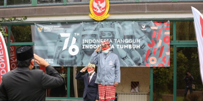 SUNDALANEWS.COM – Zagreb, Meski diguyur Hujan, Warga Negara Indonesia (WNI) di Kroasia tetap semangat ikut Upacara Bendera Hari Ulang Tahun (HUT) Republik Indonesia (RI) ke- 76 yang di selenggarakan di Kedutaan Besar Republik Indonesia (KBRI) Zagreb, Kroasia, (17/8/2021).