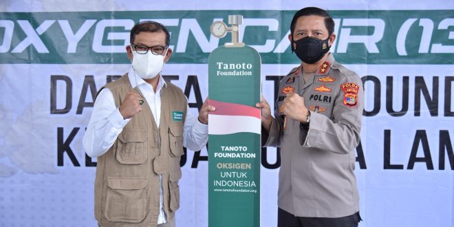 SUNDALANEWS.COM – Guna menekan angka kasus kematian akibat Covid-19, Tanoto Foundation salurkan bantuan Oksigen cair sebanyak 13,5 ton melalui Polda Lampung. Kapolda Lampung Irjen Pol Hendro Sugiatno menerima langsung penyerahan bantuan oksigen liquid dari Tonoto Foundation yang di wakili oleh Ari Gudadi, selaku Direktur Eksternal Affairs, di Mapolda Lampung, Senin (9/8/2021).