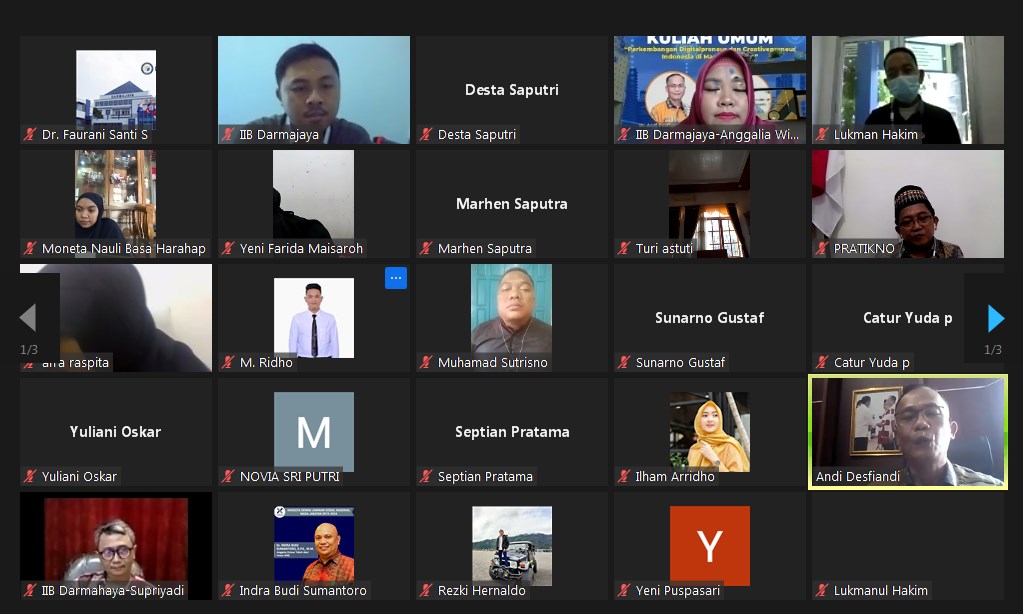 Kuliah umum bagi sekitar 50 mahasiswa dan mahasiswa baru pascasarjana itu melalui zoom dengan moderator Dr. Anggalia Wibasuri, S.Kom., M.M, juga menghadiri pembicara lainnya, yaitu Dr. Faurani Santi I. Singagerda, S.E., M.Sc.