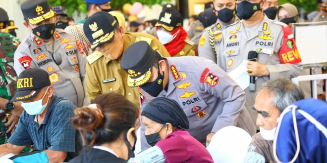 SUNDALANEWS.COM – Kapolri Jenderal Listyo Sigit Prabowo meninjau kegiatan percepatan akselerasi vaksinasi serentak seluruh Indonesia dengan hadir secara langsung di Gedung Graha Wangsa, Lampung, Selasa (11/1/2022).