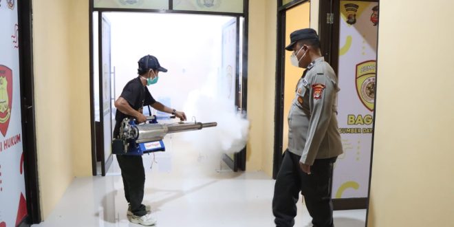 “Pengasapan atau fogging dilakukan disejumlah titik di Mako Polres seperti ruang kerja, halaman Mako Polres, tempat pelayanan public serta saluran air dan tempat adanya genangan air turut disemprot asap fogging”, jelas Sunhot.