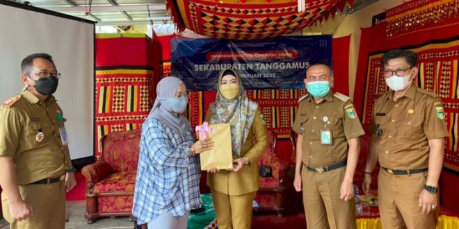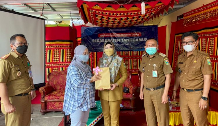 TANGGAMUS (Sundalanewa.com) : Bupati Tanggamus Dewi Handajani, menghadiri kegiatan Pembinaan Komunitas Baca oleh Kantor Bahasa Provinsi Lampung, di Taman Anjung Baca Pintar, Pekon Sukabanjar, Kecamatan Gunungalip, Senin (7/2/2022) kemarin. Turut mendampingi, Kadis Pendidikan Yadi Mulyadi, Camat Gunungalip Sutoto, dan Kepala Pekon Sukabanjar.