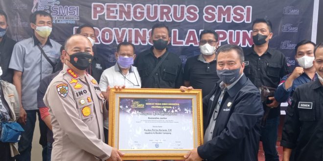 Bandar Lampung (SUNDALANEWS.COM) – Serikat Media Siber Indonesia (SMSI) Provinsi Lampung memberikan penghargaan kepada Kepala Kepolisian Republik Indonesia Resor Kota (Polresta) Bandar Lampung, Kombes Pol Ino Harianto, SIK, dan Kapolsek Teluk Betung Utara Kompol Robi Bowo Wicaksono, SH, bertempat di kantor SMSI Provinsi Lampung, Kamis (10/2/2022).