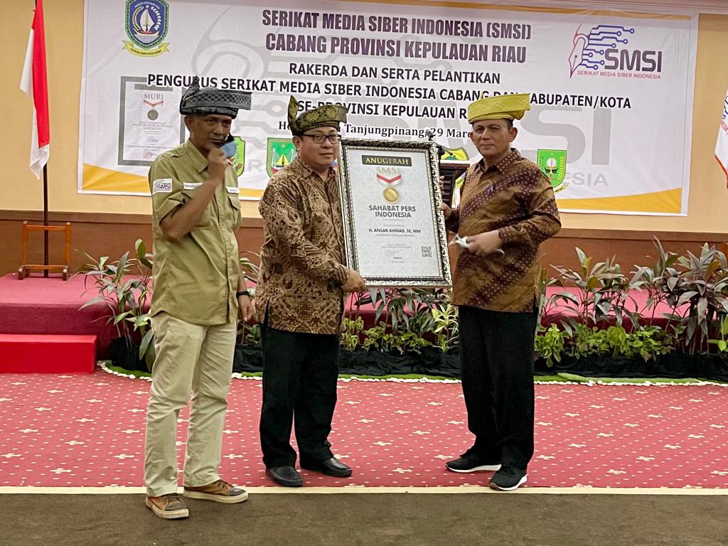 Ketum SMSI Firdaus melantik pengurus SMSI Kepri memberikan Anugrah Sahabat Pers Indonesia kepada Gubernur Kepri Ansar Ahmad sebagai gubernur yang peduli dengan pers.