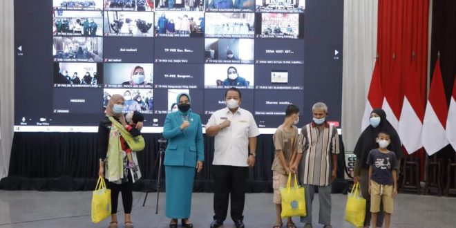 Riana Sari Arinal juga menyerahkan bantuan sembako kepada masyarakat yang membutuhkan, dilakukan serentak oleh TP PKK di 15 Kabupaten/Kota Se-Provinsi Lampung.