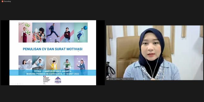 BANDARLAMPUNG (sundalanews.com) – Warung Prancis Institut Informatika dan Bisnis (IIB) Darmajaya menggelar Webinar Pembuatan CV dan Surat Motivasi pada Senin (21/3/22).Kegiatan tersebut disampaikan langsung Penanggung Jawab Campus France Jakarta Institut Francais d’Indonesia, Nur Fitria, melalui platform zoom meeting. Webinar diikuti mahasiswa IIB Darmajaya juga dihadiri Kepala UPT International Office, Muhammad Dwiyan Aditiya, dan Penanggung Jawab Warung Prancis IIB Darmajaya, Sherli Trisnawati, S.Kom., M.T.I.