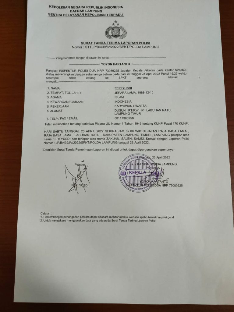 Untuk diketahui, peristiwa pertikaian maut tersebut, pihak keluarga RD melaporkan kejadian yang di alaminya ke Polda Lampung, dengan laporan penganiayaan dan pengroyokan yang dilakukan ZN bersama rekan rekannya. Dengan bukti laporan Nomor : STTLP/B/439/V/2022/SPKT/ Polda Lampung.