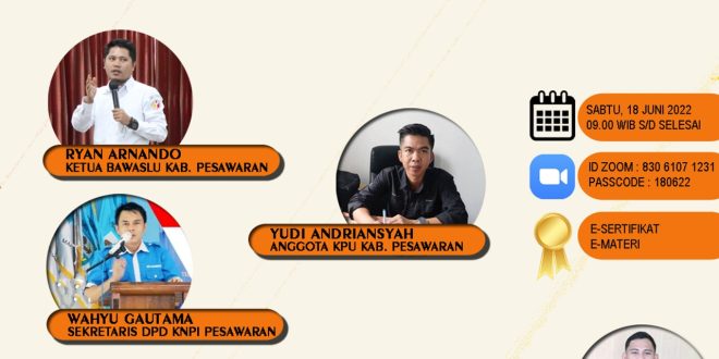 Hadir sebagai Pemateri Ryan Arnando selaku ketua Bawaslu Pesawaran, Yudi Andriansyah Anggota KPU Pesawaran, dan Wahyu Gautama sekretaris DPD KNPI Pesawaran, yang di ikuti sebanyak 100 Peserta terdiri dari Pemuda dan masyarakat umum.