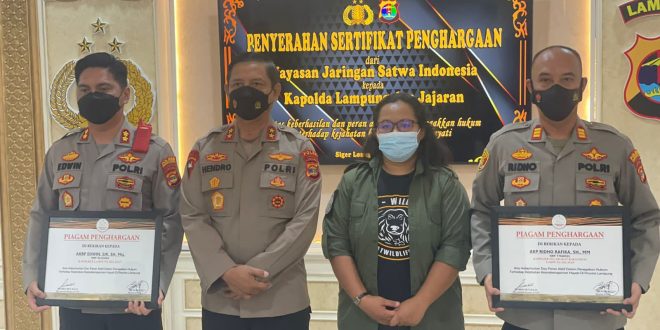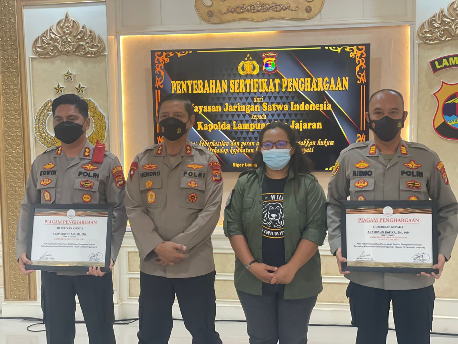 Bandarlampung (sundalanews.com) – Kapolda Lampung Irjen Pol Hendro Sugiatno bersama 28 personel Polda Lampung menerima sertifikat penghargaan dari Yayasan Jaringan Satwa Indonesia (YJSI) Lampung atas keberhasilan dan peran aktif dalam penegakkan hukum terhadap kejahatan keanekaragaman hayati di Provinsi Lampung.