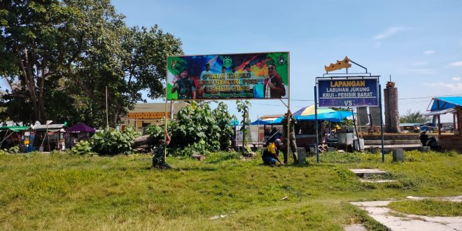 Suasana pagi yang cukup cerah , personel satuan Kodim 0422/LB dibawah pimpinan Kapten Inf Waniran selaku perwira seksi Teritorial melakukan pembersihan disekitar Lapangan guna penyiapan ajang liga santri tersebut , Minggu(19/06)