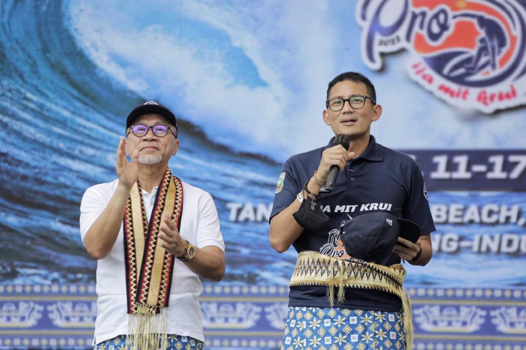 PESISIR BARAT (sundalanews.com) – Menteri Pariwisata dan Ekonomi Kreatif Sandiaga Salahuddin Uno, didampingi Wakil Gubernur Lampung Chusnunia Chalim membuka World Surf League (WSL) Krui Pro QS 5000 Tahun 2022, di Pantai Tanjung Setia, Kabupaten Pesisir Barat, Sabtu (11/06/2022).