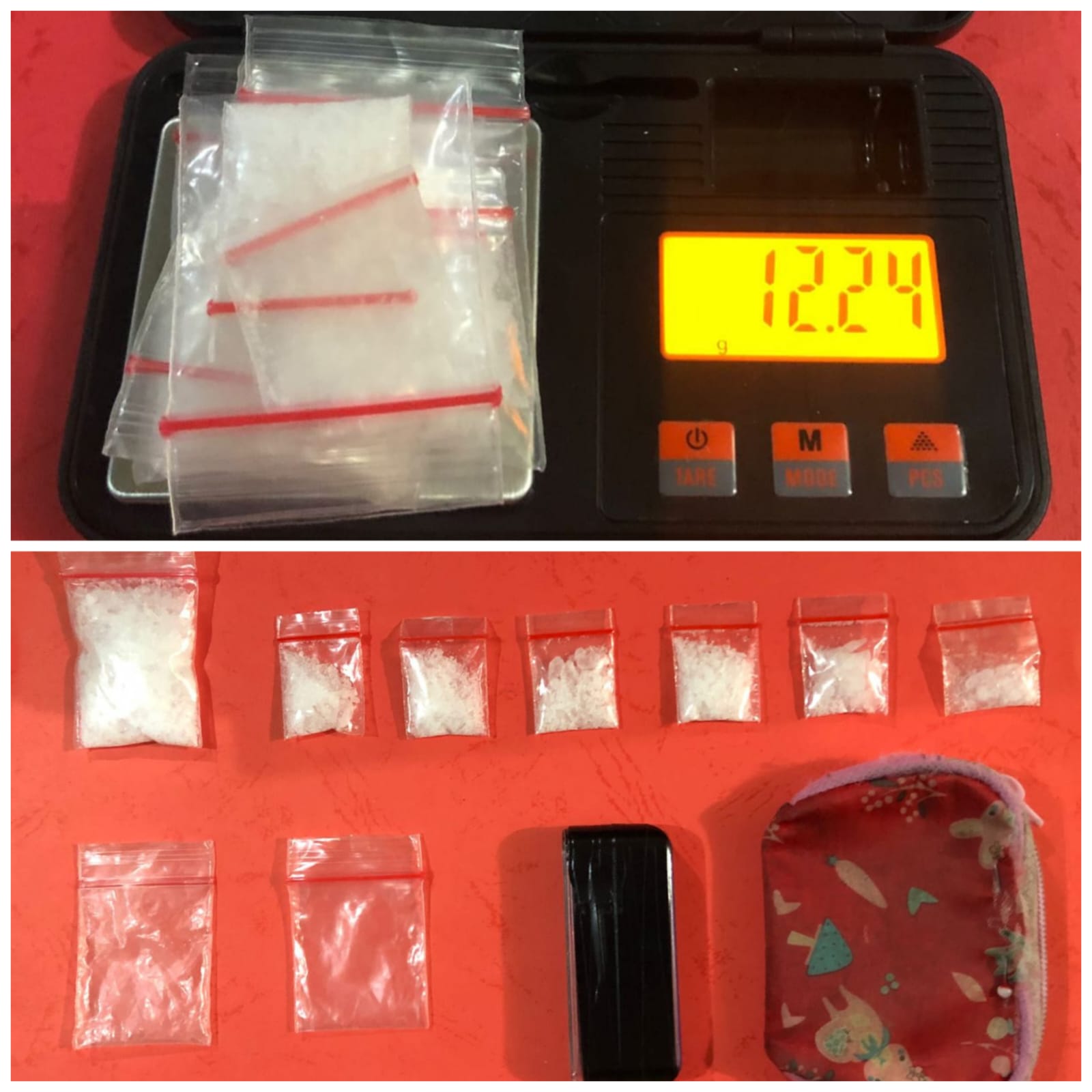 Dari terduga (AK) di temukan barang bukti berupa kristal putih diduga narkotika jenis sabu yang telah di kemas kedalam 7 (tujuh) buah klip plastik bening dengan berat bruto 12,24 gram, kemudian didapati juga 1 (satu) buah kotak plastik warna hitam dan 1 (satu) buah dompet warna merah.