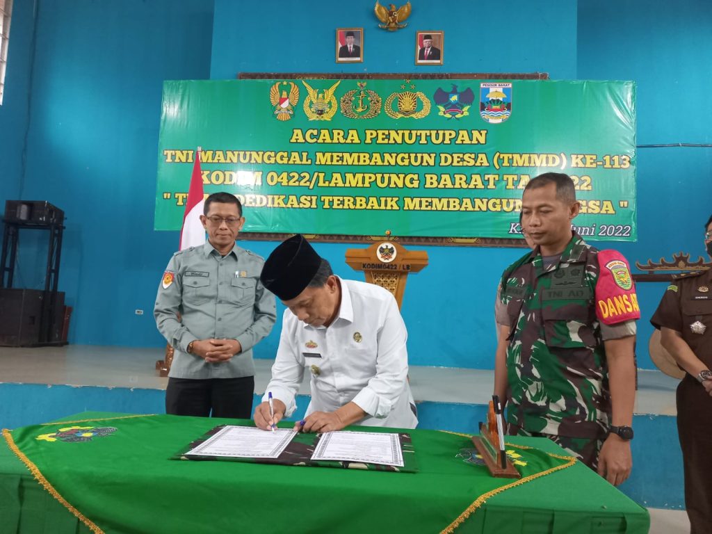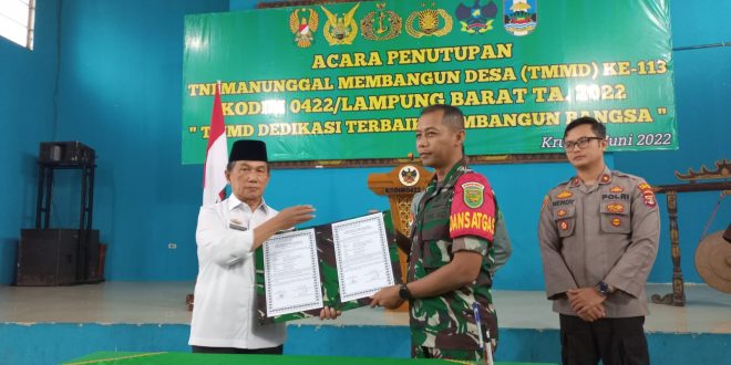 Pesisir Barat (sundalanews.com) – Pelaksanaan TNI Manunggal Membangun Desa (TMMD) ke 113 di Pekon Sukamaju kec.ngaras kab. Pesisir Barat, yang di buka pada tanggal (10 /5/2022) oleh wakil Bupati H.A Zulkoini Syarif, Hari ini resmi ditutup oleh Wakil Bupati di Gedung Serbaguna Guna (GSG) Selalau Labuhan Jukung. Kamis, (9/6/2022)