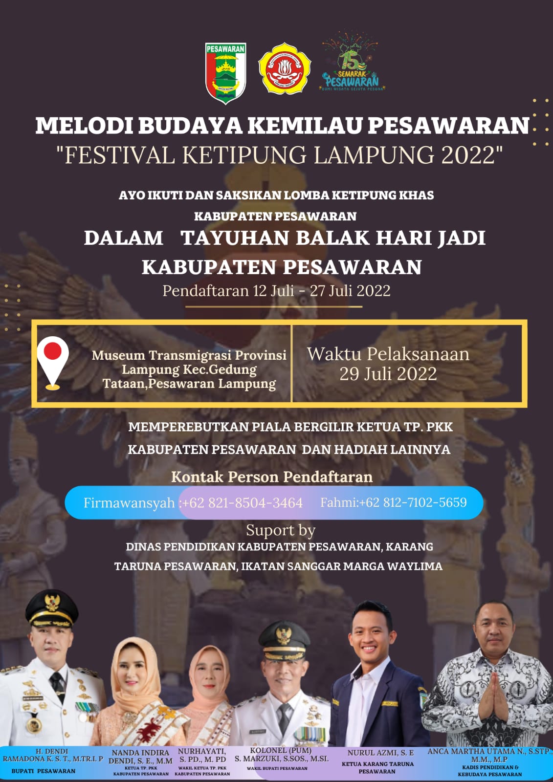 Dalam rangka HUT kabupaten Pesawaran ke 15 tahun yang bertema Bumi Wisata Sejuta Pesona, Karang Taruna Pesawaran bersama Dindikbud Pesawaran, dan Ikatan Sanggar Makhga Waylima akan menyelenggarakan Festival Ketipung Lampung 2022.