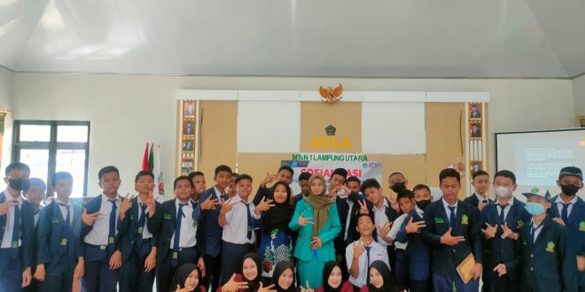 Kotabumi (sundalanews.com) – Mahasiswi Kuliah Kerja Nyata (KKN) Sang Surya Universitas Muhammadiyah Kotabumi (UMKo) penempatan Kementrian Agama Kabupaten Lampung Utara melakukan kegiatan sosialisasi di MTS N 01 Kotabumi dengan tema “Bijak Dalam Menggunakan Media Sosial di Era Digital Pada Remaja”, Selasa (23/08/2022).