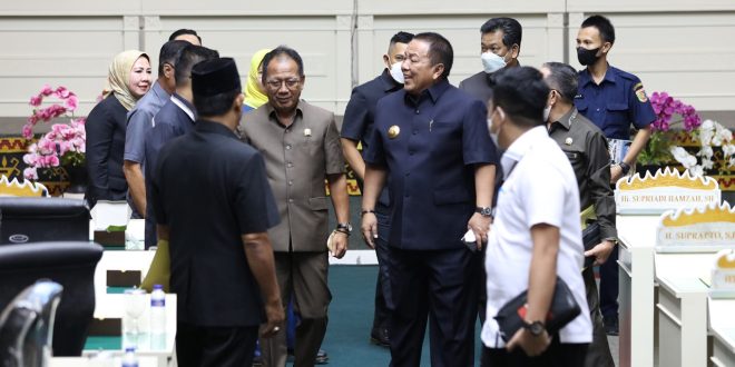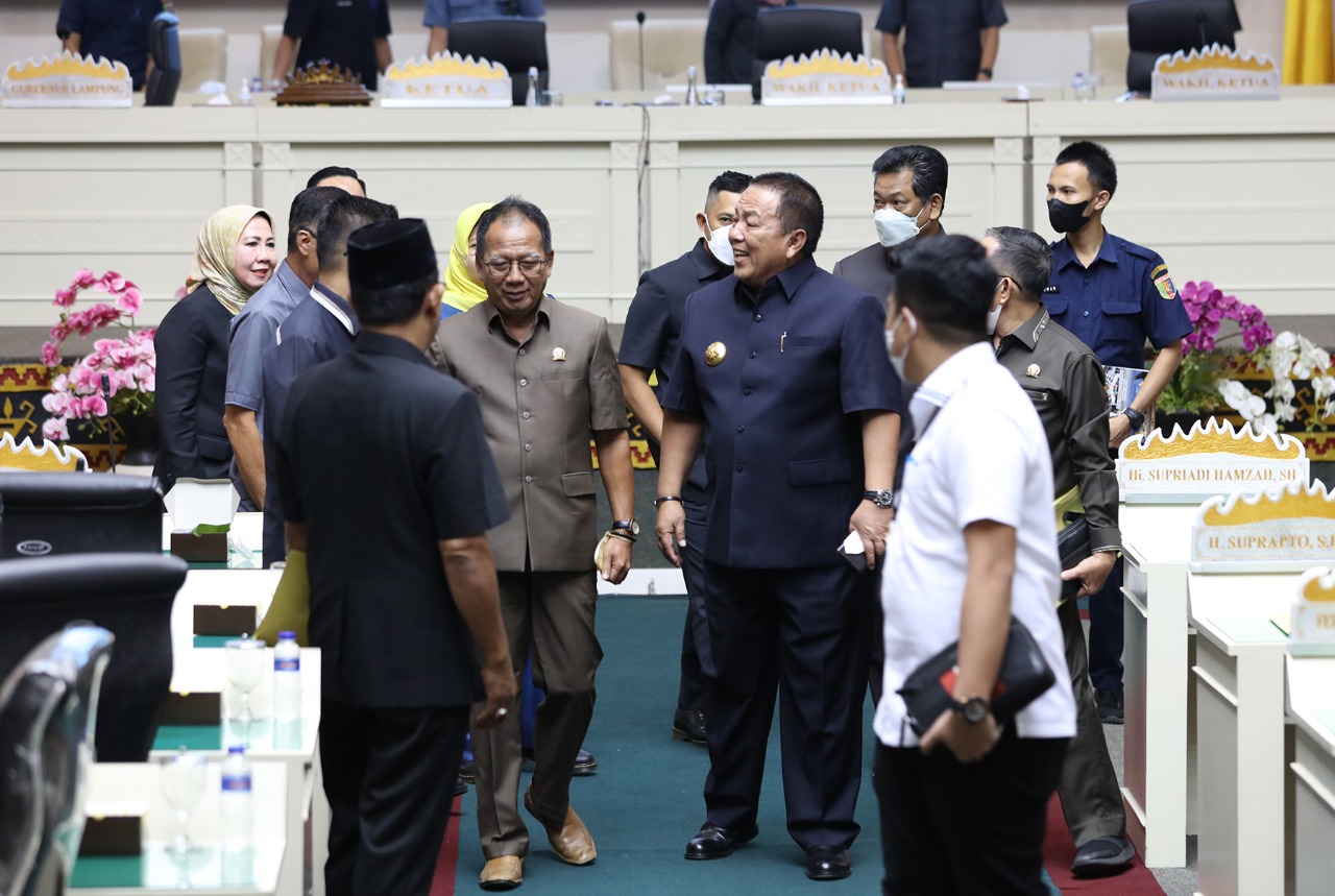 BANDARLAMPUNG (sundalanews.com) – Gubernur Lampung Arinal Djunaidi menyampaikan jawaban atas Pemandangan Umum Fraksi – Fraksi DPRD Provinsi Lampung terhadap Rancangan Peraturan Daerah (Raperda) tentang APBD Provinsi Lampung Tahun Anggaran 2023, di Ruang Rapat Paripurna DPRD Provinsi Lampung, Bandar Lampung, Rabu (26/10/2022).