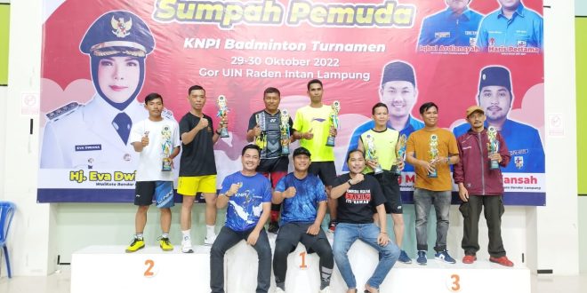 Bandar Lampung (sundalanews.com) – KNPI Badminton Turnament dalam rangka memperingati Hari Sumpah Pemuda resmi ditutup, Minggu, 30 Oktober 2022. Kejuaraan yang berlangsung selama 2 hari itu dimenangkan oleh pasangan Olka-Hendrik untuk kategori B dan pasangan Aziz-Sidiq pada kategori A.
