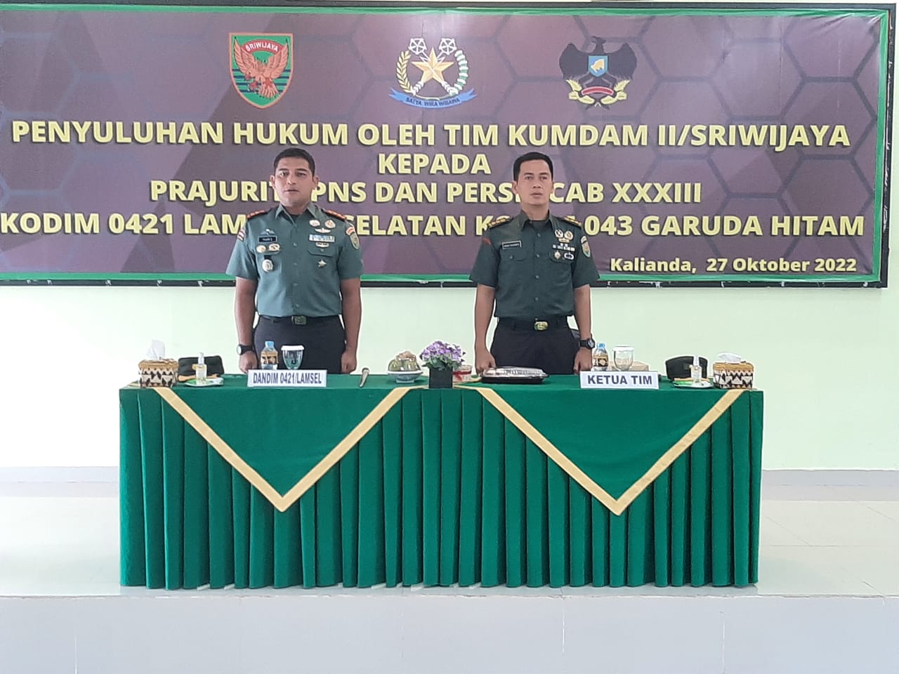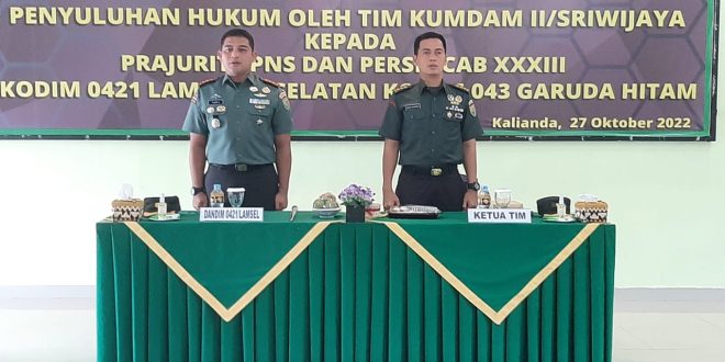 Lampung Selatan (sundalanews.com) – Kodim 0421/LS menerima materi penyuluhan hukum dari Tim Kumdam II/SWJ guna menambah wawasan dan pengetahuan tentang hukum dikalangan prajurit , PNS dan Persit KCK dijajaran satuan Kodam II/SWJ.