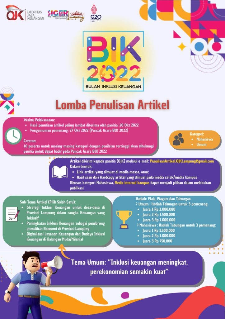 BIK Tahun 2022 di Lampung juga mengusung SIGER Lampung, Sinergi dan Kolaborasi Inklusi Keuangan untuk Perekonomian. Dalam BIK Tahun 2022 ini juga digelar lomba penulisan artikel yang bisa diikuti mahasiswa dan masyarakat umum.(ES/SUN1)