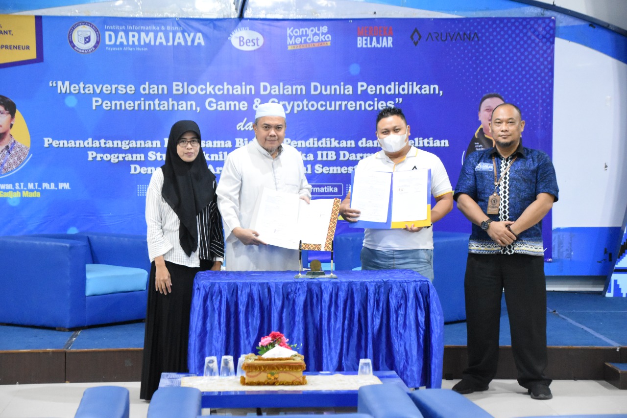 Penandatanganan dilakukan Rektor IIB Darmajaya Dr. Ir. H. Firmansyah YA, M.B.A., M.Sc. dan Ketua Program Studi Teknik Informatika Dr. Chairani, S.Kom., M.Eng dengan CEO PT. Aruvana Virtual Semesta, Indra Haryadi, S.Kom yang dihadiri juga oleh Dekan Fakultas Ilmu Komputer Dr. Sutedi, S.Kom., M.T.I.