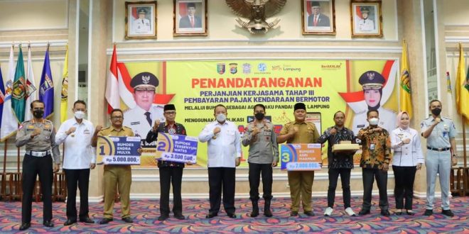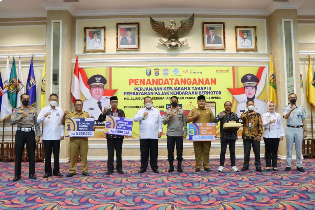 Kepala Bapenda Adi Erlansyah melaporkan pada kegiatan ini dilakukan penandatanganan perjanjian kerjasama tahap III antara Pemerintah Provinsi Lampung melalui Badan Pendapatan Daerah Provinsi Lampung, dan Dinas Pemberdayaan Masyarakat, Desa dan Transmigrasi Provinsi Lampung, bersama Polda Lampung, Jasa Raharja, Bank Lampung dan perwakilan dari 109 Bumdes se-Lampung.