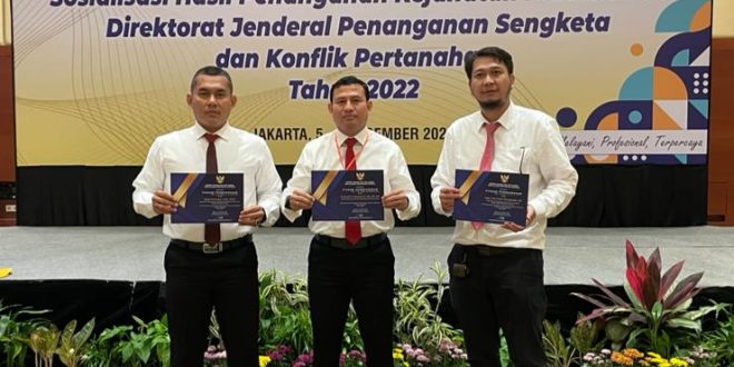 Penghargaan tersebut diserahkan langsung oleh Menteri Agraria Tata Ruang/Badan Pertanahan Nasional Hadi Tjahjanto yang di dampingi oleh Dirjen 7 Kementerian ATR/BPN kepada Kepolisian, Kejati dan BPN Provinsi Lampung di Hotel Borobudur, Jakarta.