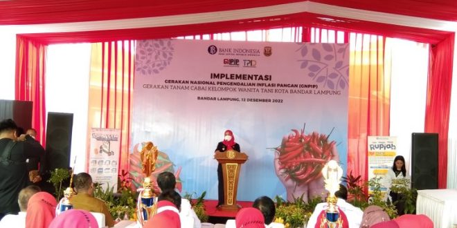 Bandar Lampung (sundalanews.com) – Walikota Bandar Lampung, Eva Dwiana menghadiri Gerakan Nasional Pengendalian Inflasi Pangan (GNPIP) dengan Kelompok Wanita Tani (KWT) Kota Bandarlampung oleh perwakilan Bank Indonesia Provinsi Lampung, bertempat di Jalan P. Emir M Noer, Kelurahan Pengajaran Kota Bandar Lampung, Senin (12/12/2022).