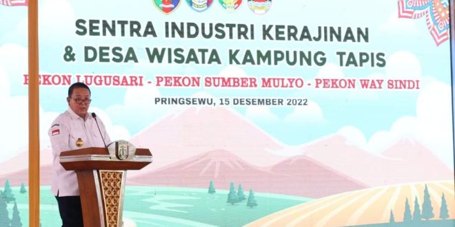 PRINGSEWU (sundalanews.com) – Gubernur Lampung Arinal Djunaidi canangkan Tiga Desa di Provinsi Lampung sebagai Sentra Industri Kerajinan dan Desa Wisata Kampung Tapis, saat lakukan kunjungan kerja ke Kabupaten Pringsewu, di lokasi wisata Ledeng Pendem (Lependem) Belanda Pekon Lugusari, Kecamatan Pagelaran, Pringsewu, Kamis (15/12/2022).
