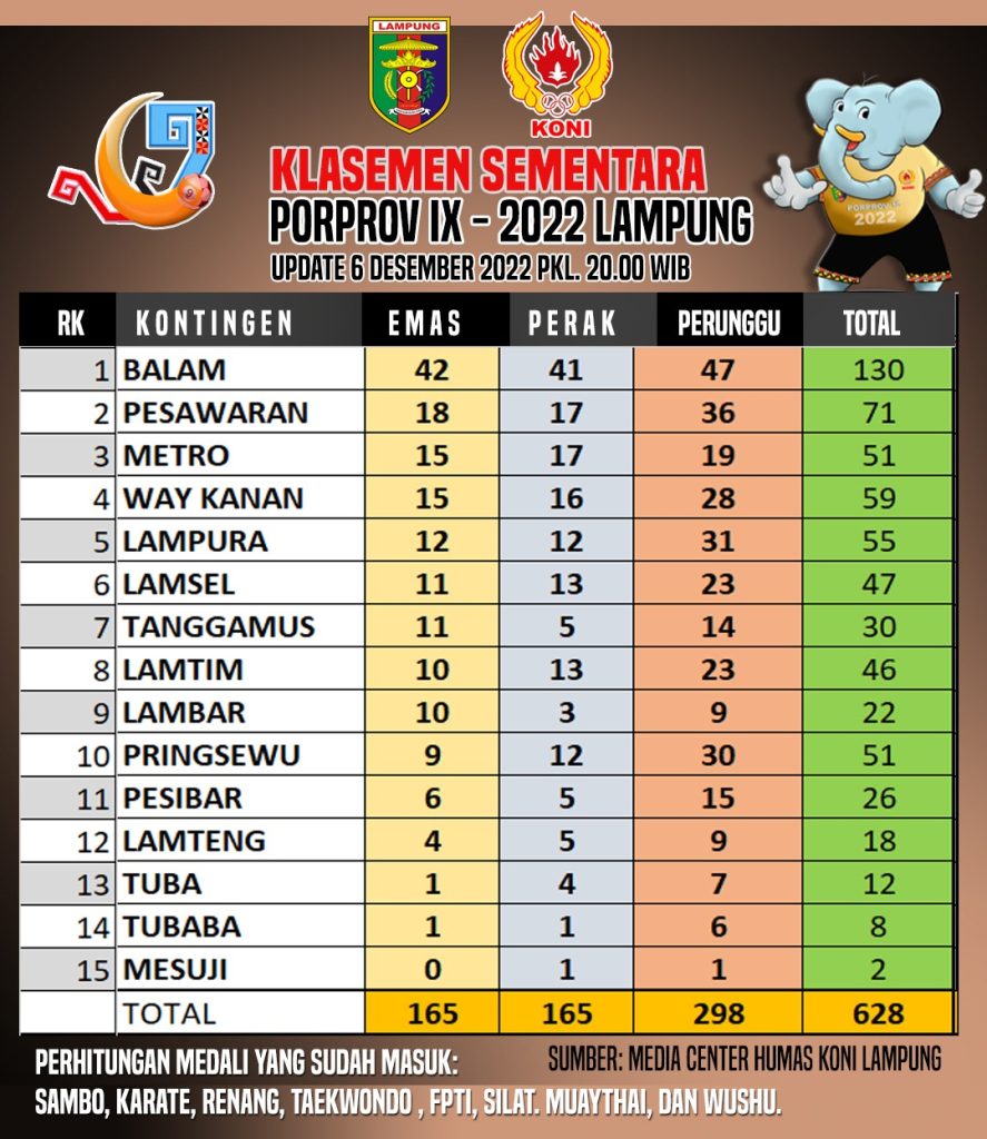 Klasmen Perolehan Medali Porprov IX Lampung 7 Desember 2022 headline, Olahraga Leave a comment 595 Views Bagikan Ke Share Facebook Twitter LinkedIn Pinterest