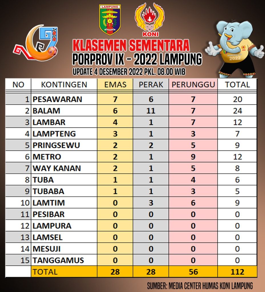 Berikut Sebagian perolehan medali yang sudah dapat dihimpun dari media center Humas KONI Lampung: