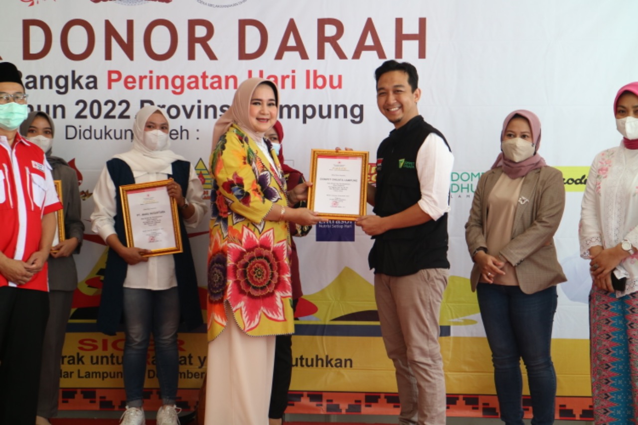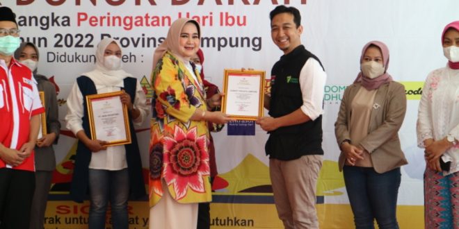 Bandar Lampung (sundalanews.com) – Dompet Dhuafa Lampung sebagai lembaga filantropi Islam milik masyarakat yang berkhidmat dalam pemberdayaan kaum dhuafa menjadi salah satu jajaran sponsor yang menerima apresiasi Piagam Donasi dan Partisipasi pada Agenda Siger Donor Darah dari Riana Sari Arinal, Ketua Pengurus PMI Provinsi Lampung.