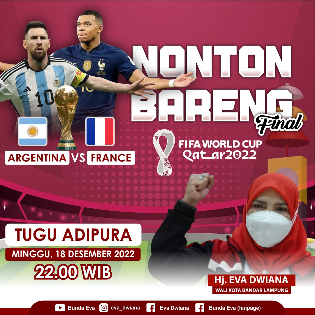Pemkot akan menggelar Nobar Gratis Final Piala Dunia antara Timnas Argentina vs Perancis Minggu malam, kita juga akan mengandeng UMKM Kota Bandarlampung,” kata Bunda Eva, sapaan akrabnya, Jumat (16/12/2022).