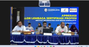 BANDARLAMPUNG (sundalanews.com) – Institut Informatika dan Bisnis (IIB) Darmajaya mengikuti Apresiasi Calon Lembaga Sertifikasi Profesi (CLPS) yang diselenggarakan Badan Nasional Sertifikasi Profesi (BNSP) secara daring pada Rabu, (24/8/22).Apresiasi CLPS merupakan rangkaian dalam pembentukan Lembaga Sertifikasi Profesi (LSP) oleh BNSP. Kegiatan yang dilakukan secara daring tersebut dihadiri perwakilan BNSP Drs. Mulyanto, …