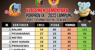 BANDAR LAMPUNG (Sundalanews.com) – Hingga Rabu (7/12/2022) malam, kontingen Bandar Lampung masih memimpin perburuan medali Pekan Olahraga Provinsi (Porprov) IX Lampung. Pada event olahraga akbar tingkat provinsi empat tahunan tersebut, anak-anak Bandar Lampung terus mendulang medali, baik pada cabang olahraga perseorangan maupun tim. Sampai Rabu malam, kontingen Bandarlampung belum terbendung …