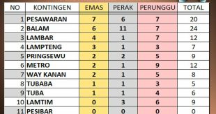 Bandar Lampung (sundalanews.com) – Kontingen Kabupaten Pesawaran bertekad melanjutkan tren positif sebagai pemuncak klasemen raihan medali pada Porprov IX Lampung 2022. Untuk sementara Kabupaten Pesawaran menduduki peringkat teratas dengan 7 medali emas, 6 perak, 9 perunggu diikuti Bandarlampung 6 emas, 11 perak dan 7 perunggu. Bupati Kabupaten Pesawaran mengapresiasi raihan …