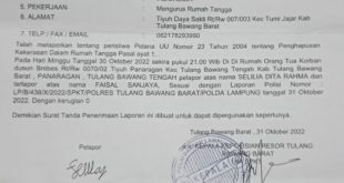 TUBABA (sundalanews.com) – Diduga menjadi korban kekerasan dalam rumah tangga (KDRT)Seorang ibu rumah tangga berinisial SDR (25) tahun warga Dusun Brebes, Tiyuh (Desa) Panaragan, Kecamatan Tulang Bawang Tengah (TBT) Kabupaten Tulangbawang Barat (Tubaba), Provinsi Lampung melaporkan suaminya ke unit PPA Polres Tubaba. Korban SDR mengatakan dirinya sudah tidak tahan lagi …