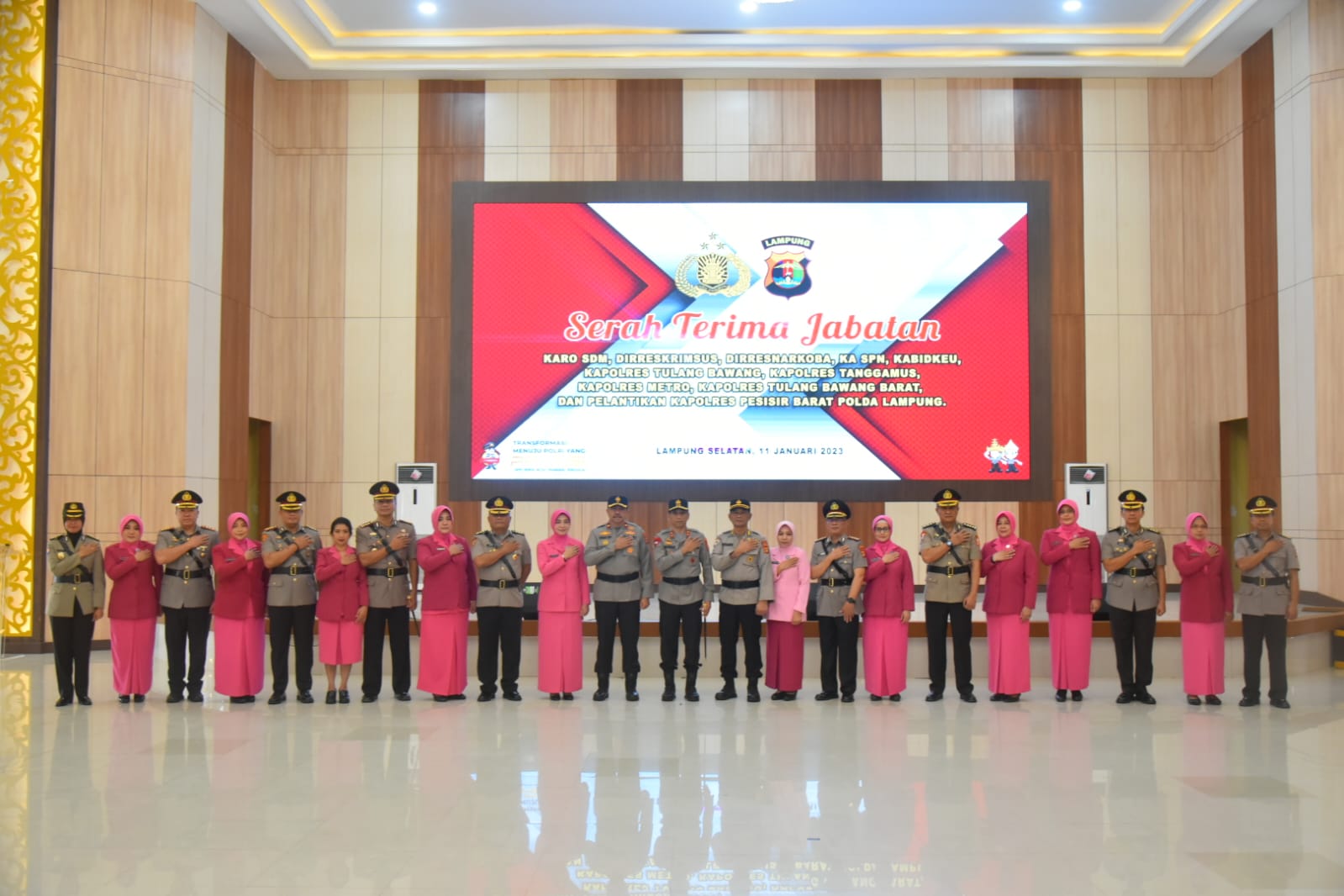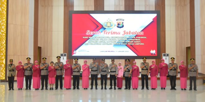 Bandar Lampung (sundalanews.com) – Kapolda Lampung, Irjen Pol Akhmad Wiyagus, pimpin upacara serah terima jabatan (Sertijab) lima pejabat utama dan lima pejabat Kapolres jajaran Polda Lampung, bertempat di aula GSG presisi, Rabu (11/1/2023).