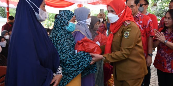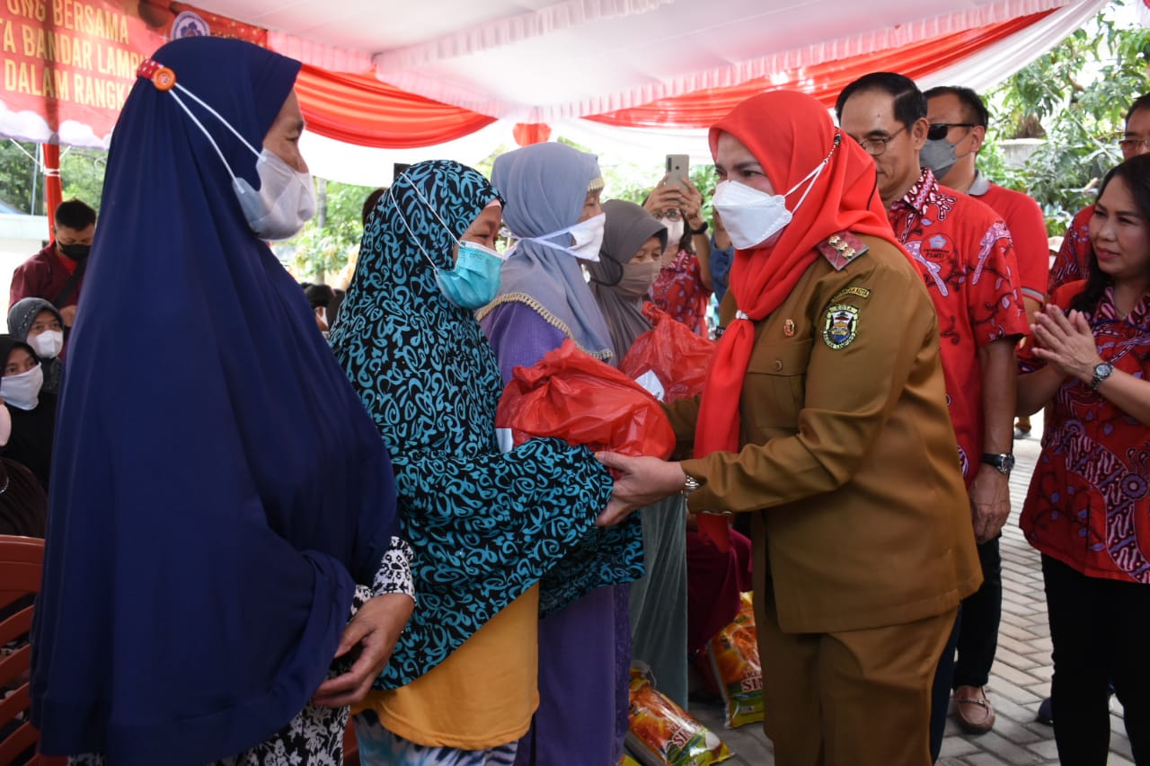 Walikota Bandarlampung, Eva Dwiana mengucapkan terima kasih kepada PSMTI Provinsi Lampung yang telah berbagi paket sembako bagi warga Kecamatan Bumiwaras.