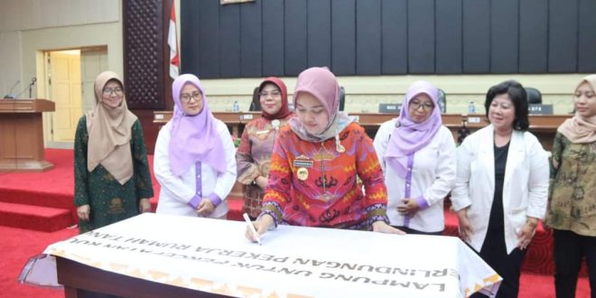 Dalam acara tersebut dilakukan juga penandatanganan percepatan RUU Perlindungan Pekerja Rumah Tangga dan Launching Buku Saku Rumah Perempuan dan Anak. (Dinas Kominfo dan Statistik Provinsi Lampung)
