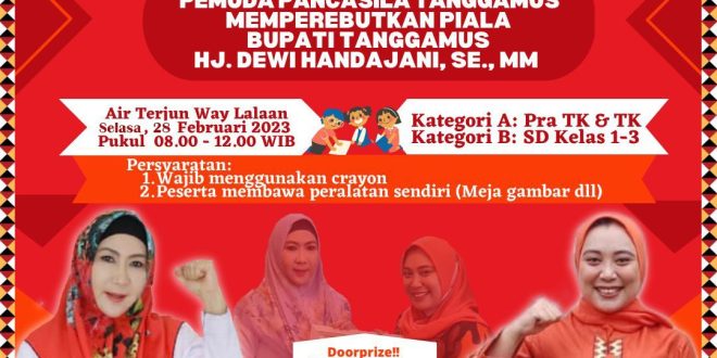 Tanggamus (sundalanews.com) – Dewan Pimpinan Cabang Srikandi Pemuda Pancasila (DPC Srikandi PP) Kabupaten Tanggamus akan menggelar Lomba Mewarnai Pra TK, TK dan SD untuk Kls I dan 3, Kegiatan Tersebut akan dilaksanakan di wisata Air Terjun Way Lalaan pada 28 February 2023 yang akan datang.