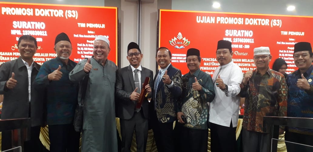 Suratno dinyatakan berhasil menyelesaikan disertasi dengan Promotor Prof. Dr. H. Alamsyah, M.Ag.; Co-Promotor I Dr. H. Yusuf Baihaqi, M.A. dan Co-Promotor II Dr. Maimun, M.Ag., dengan judul Disertasi Pencegahan Perceraian Melalui Program Mastūrah, dan Kontribusinya Terhadap Pembaharuan Hukum Keluarga di Indonesia (Studi Jamâ’ah Tabligh Provinsi Lampung).