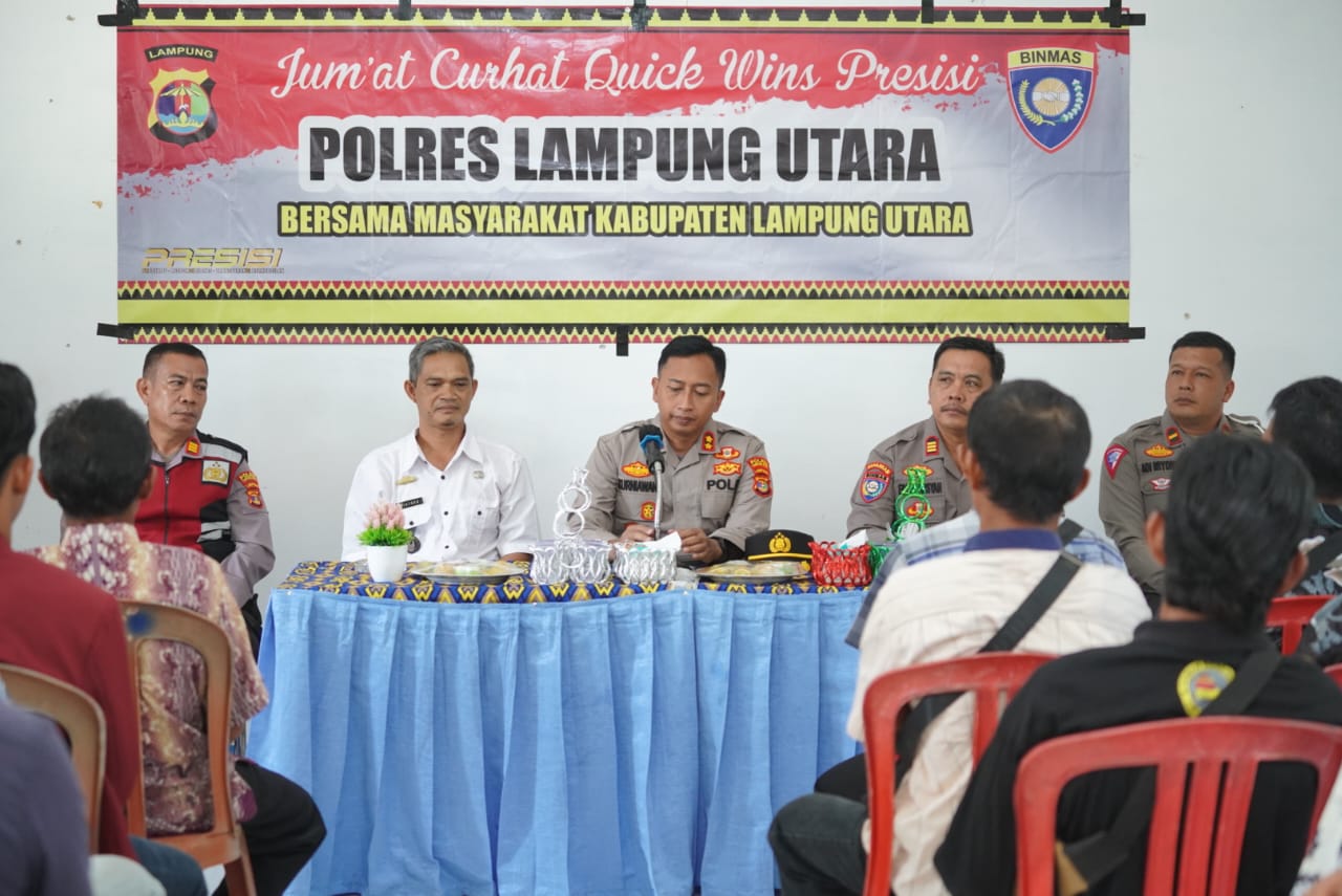 Dirinya mengajak masyarakat agar tetap selalu aktif, tidak boleh lengah dengan ancaman kejahatan harus tetap kita waspadai, yang namanya kejahatan itu dapat terjadi apabila niat para pelaku berpadu dengan adanya kesempatan, oleh karenanya harus kita cegah. “kata AKBP Kurniawan saat menggelar silaturahmi kepada warga di Desa Sumber Arum Kecamatan Kotabumi Kota dalam program kegiatan “Jumat Curhat” , Jumat (03/02/2023).