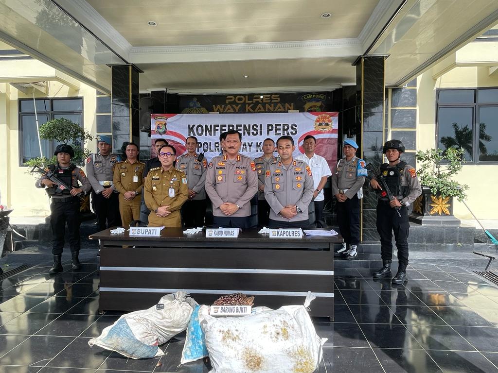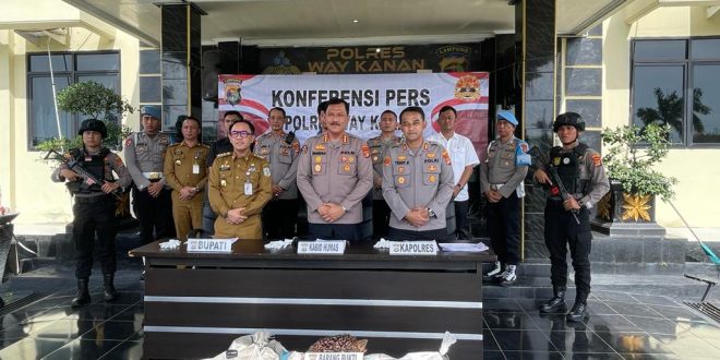Bandar Lampung (sundalanews.com) – Kabid Humas Polda Lampung Kombes Pol Zahwani Pandra Arsyad didampingi Bupati Way Kanan Raden Adipati Surya dan Kapolres Way Kanan AKBP Teddy Rachesna berkesempatan hadir pada kesempatan siang hari ini dalam rangka konferensi pers terhadap pengungkapan kasus tindak pidana Curat (pencurian dengan pemberatan) tandan buah sawit di areal perkebunan sawit PT. AKG (Adhi Karya Gemilang) Bahuga, Kampung Bumi Agung Kecamatan Buay Bahuga Kabupaten Way Kanan.