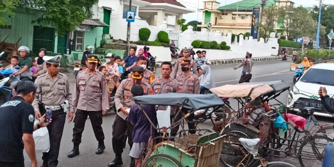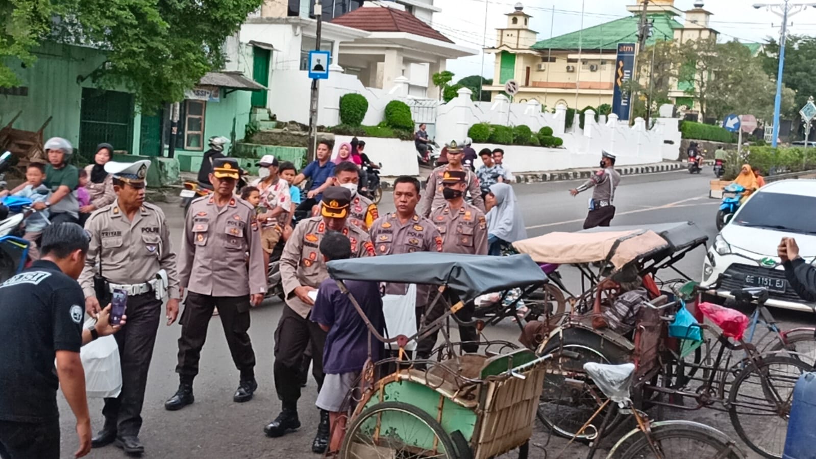 “Kami bagikan 100 kotak makanan untuk tukang becak, tukang rongsokan, pedagang asongan yang ada di sepanjang Jalan Jendral Sudirman,” kata Kapolres.