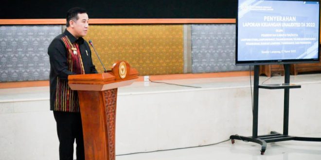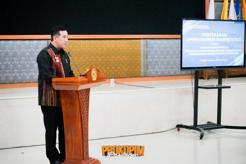 Bupati Pesawaran mewakili Bupati dan Walikota di Provinsi Lampung memberikan sambutan dalam rangka Penyerahan Laporan Keuangan Pemerintah (LKPD) Unaudited Tahun Anggaran 2022 yang diterima oleh Kepala BPK-RI Perwakilan Lampung, Yusnadewi beserta jajarannya.