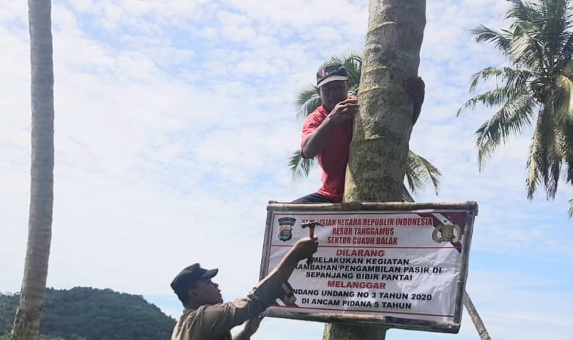 Tanggamus (sundalanews.com) – Sebagai langkah pencegahan terhadap aksi penambangan ilegal pasir laut, Polsek Cukuh Balak pasang papan informasi larangan melalui Banner di pesisir 2 pantai di Kecamatan setempat serta memberikan teguran kepada masyarakat.