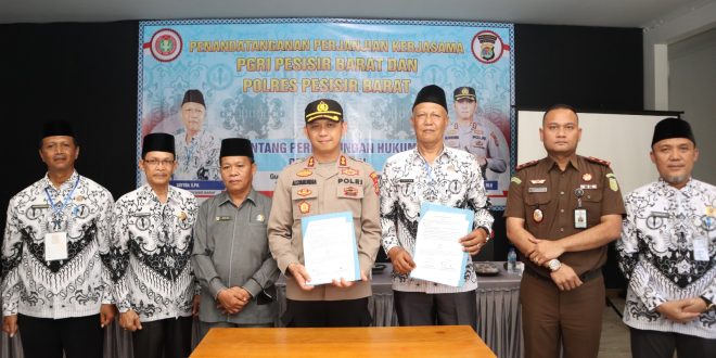 Pesisir Barat (sundalanews.com) – Kapolres Pesisir Barat AKBP ALSYAHENDRA, S.IK, M.H melaksanakan kegiatan Penandatanganan Perjanjian Kerjasama PGRI Pesisir Barat dan Polres Pesisir Barat tentang perlindungan hukum profesi guru di aula Hotel Sartika pekon seray Kecamatan pesisir tengah Kabupaten Pesisir Barat hari Rabu sekitar pukul 14.00 WIB (15/03/2023).