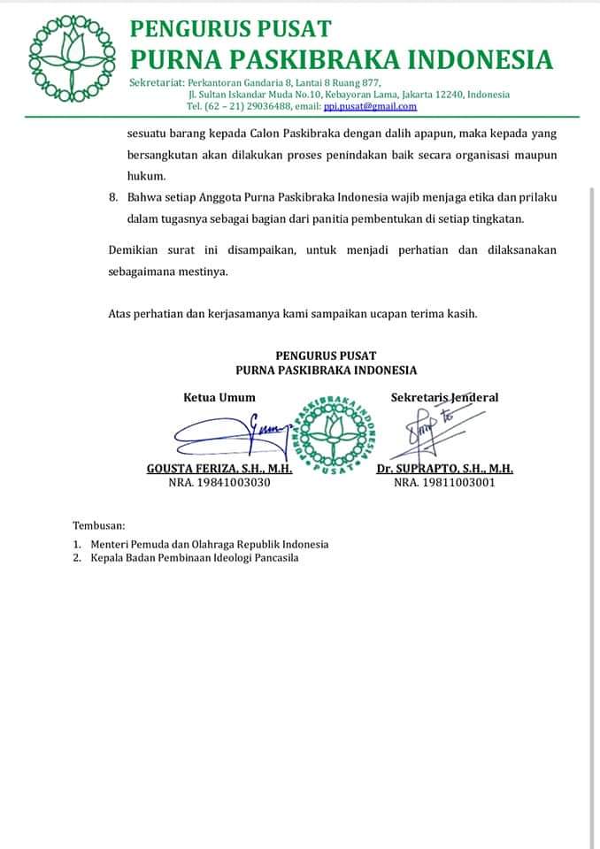 - Bahwa apabila diketemukan adanya laporan dan bukti-bukti kuat ada Anggota Purna Paskibraka Indonesia yang meminta dan/atau mengutip uang dan/atau sesuatu barang kepada Calon Paskibraka dengan dalih apapun, maka kepada yang bersangkutan akan dilakukan proses penindakan baik secara organisasi maupun hukum.