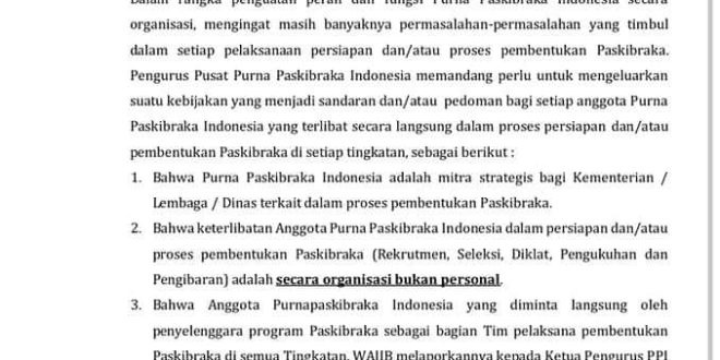 - Bahwa Anggota Purna paskibraka Indonesia yang diminta langsung oleh penyelenggara program Paskibraka sebagai bagian Tim pelaksana pembentukan Paskibraka di semua Tingkatan, WAJIB melaporkannya kepada Ketua Pengurus PPI sesuai tingkatan untuk mendapatkan Surat Tugas Resmi dari organisasi PPI. Keterlibatan Anggota PPI secara personal segala sesuatunya menjadi TANGGUNG JAWAB PRIBADI yang bersangkutan.
