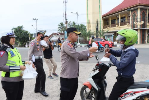 Disela-sela pembagian takjil, Kapolres Pesawaran memberikan himbauan kepada para pengendara agar berhati-hati dan selalu mematuhi peraturan lalu lintas demi terciptanya Kamseltibcar Lantas di Jalan Lintas Barat.